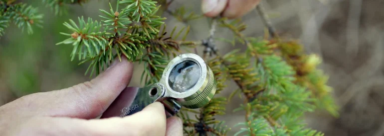 Figure 7: Arborist using a hand lens to inspect spruce needles for fungal pathogens during disease diagnosis. (Image Credits: Dave Wallis / The Forum)