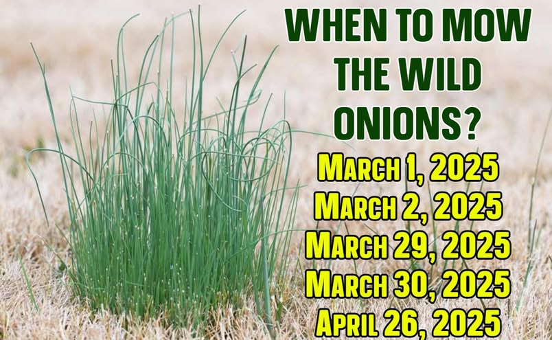 Wild onion mowing guide; ideal cutting dates in spring 2025 to weaken regrowth and prevent bulb spread.