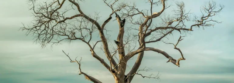 A lone, leafless tree stands as a stark reminder of nature’s resilience and decay.