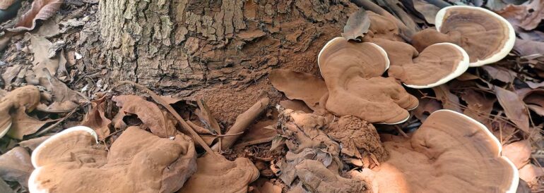 Fungal growth at the base of a tree, indicating potential root rot and decay.