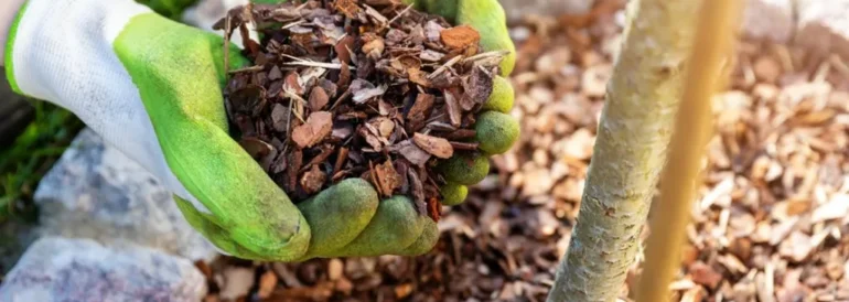 Applying mulch around a young tree to enhance growth and moisture retention.